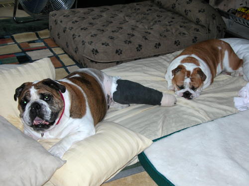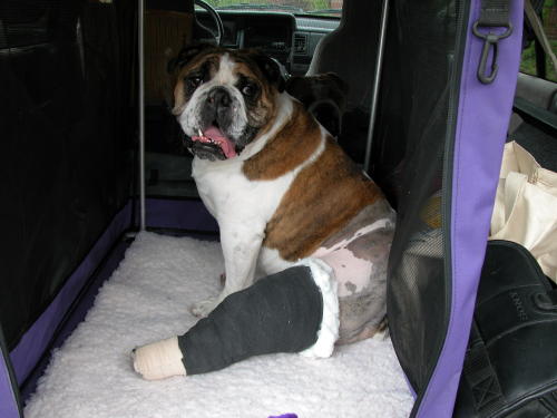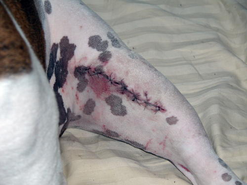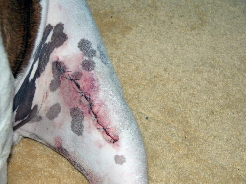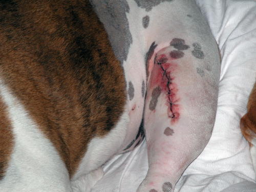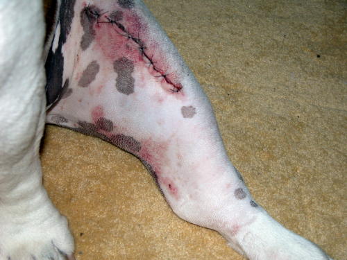 Brodie's incision is a bit more red today but still looking real good. Not too much swelling of his leg. He is using his leg very well when we got out for potty breaks.