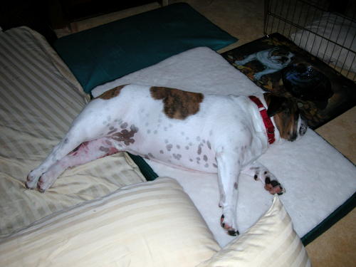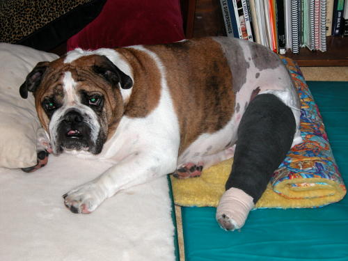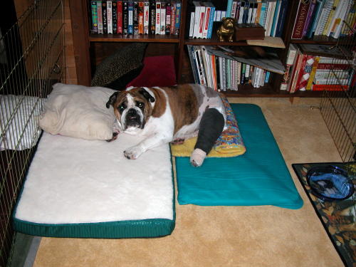 Day 3: Brodie's bandages came off today. Without the support, he is walking more gingerly on it. I tried to do some range of motion exercises but it was very painful to him, so I will try again tomorrow. Otherwise he is doing very well. Sleeping and eating normally.