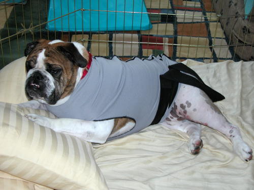 Here's Brodie wearing his Surgi-Sox. It's a pet lift system made of Corium so it is breathable. It helps me get Brodie up the stairs. He is still being carried down, but I have a call into a carpenter to have a ramp built from my second story deck to my backyard. That would be a back saver!