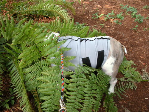 Day 7: On one of three potty breaks a day, Brodie checks out a fern.