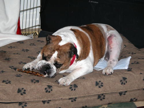 Brodie still has the fluid pocket around his ankle so he got one of his beloved Bully Sticks so that Mom could massage and apply a warm pack to it.